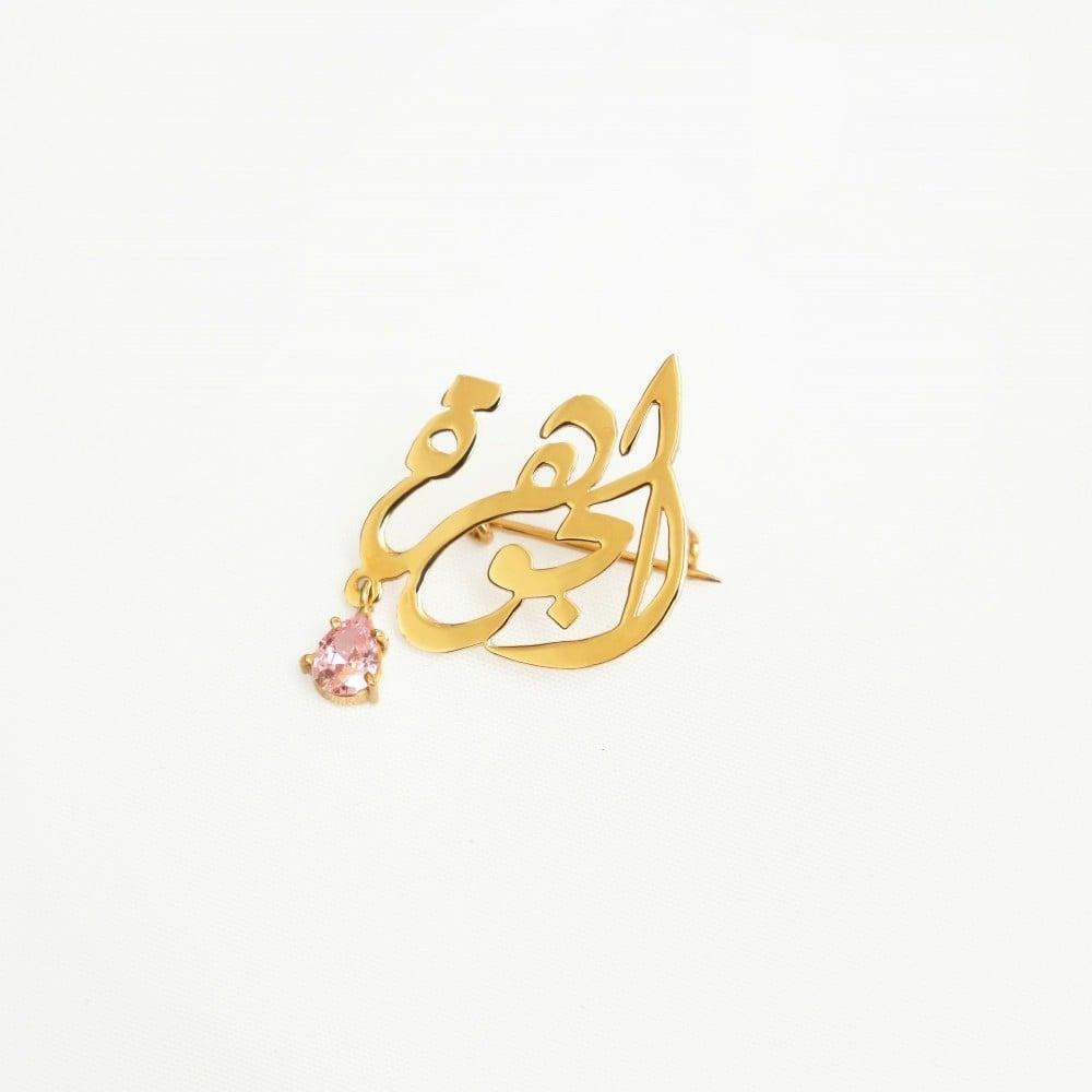 أضفي لمسة من الأناقة والفخامة على إطلالتك مع دبوس اسمك المخصص. مصنوع من أجود أنواع الطلاء الذهب عيار 21 قيراط، مزين بحجر كريستال وردي لامع. تصميم أنيق بخط عربي مميز، يجعله هدية مثالية لأحبائك. كل قطعة هي تحفة فنية مصنوعة يدوياً بدقة. صمم دبوسك الخاص الآن واطلبي قطعة مجوهرات فريدة من نوعها."