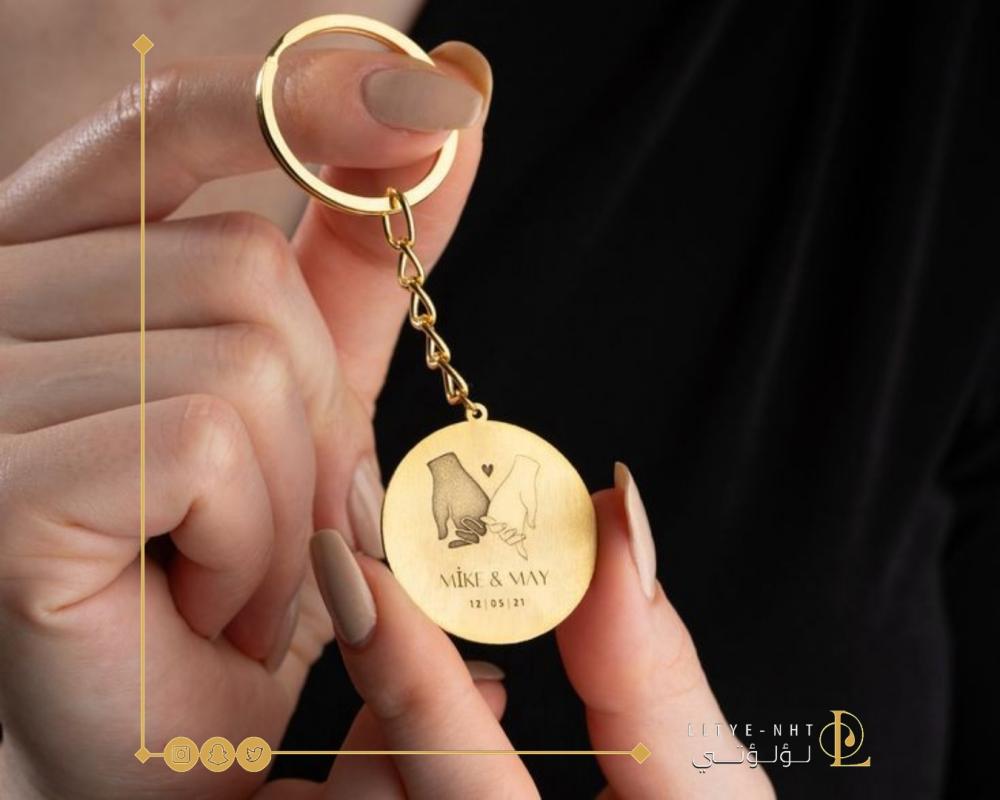 ميداليه مفاتيح ذهبية أنيقة مع نقش مخصص. تصميم فريد يجمع بين أناقة الذهب عيار 21 ونقش يدوي دقيق لاسميك وتاريخك المهم. هدية مثالية للأزواج والأصدقاء المقربين. مصنوعة من أجود أنواع الطلئ الذهب، هذه المفاتيح هي أكثر من مجرد إكسسوار، إنها قطعة فنية تعبر عن ذوقك الرفيع وحبك للأشياء الفريدة. يمكنك اختيار الخط ونوع النقش الذي يناسبك. سيتم تسليم طلبك خلال 5 أيام عمل. نضمن لك جودة المنتج لمدة عام.